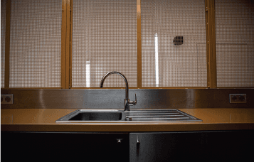 A refined granite platform paired with a stainless steel sink and glazed dado tiles up to 2 feet-blending durability with design.