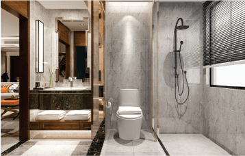 Designer glazed wall tiles up to 7'height, anti-skid flooring, and wall-mounted W.C. deliver functionality wrapped in aesthetics.