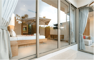 Sleek UPVC or aluminium powder-coated sliding doors offer seamless transitions and excellent weather resistance.